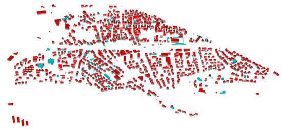 Most of the buildings are in LOD2, but some of the buildings are represented only in LOD1 (blue in Figure 2), so their actual roof shape is not known. 46% of the buildings are garages or sheds that are not heated. The remaining 872 buildings with a total footprint area of 109,919 m are mainly residential buildings (89%), the rest are either used for industry, offices or retail.