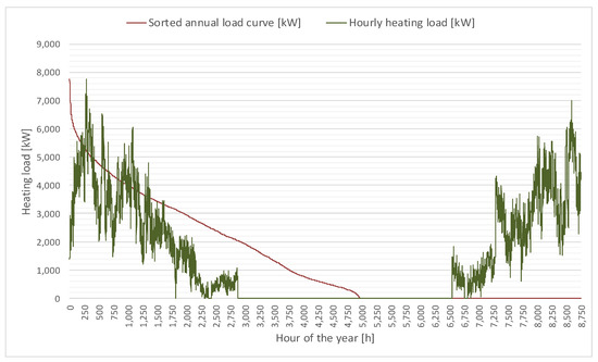 Then, the monthly values are transferred into hourly values as described in Section 2.2. The hourly demand of each building is cumulated for each time step and ordered in a sorted annual heat load curve according to the value of the heat demand of each time step (see Figure 6). The total annual heat demand of Walheim amounts to approximately 12,500 MWh/a with a peak load of 7767 kW in January. The considered heating season is October until April. Domestic hot water is not included in this assessment.