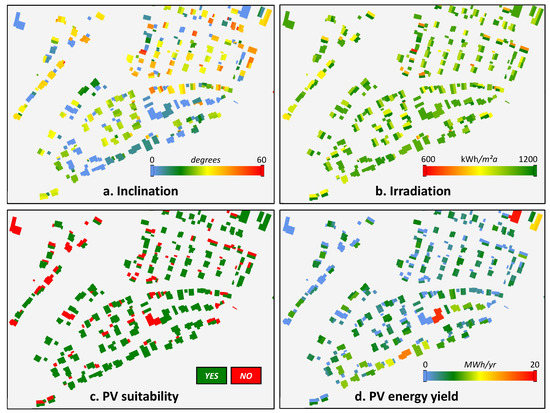 Another important step for reducing emissions is to use the solar irradiance to produce electricity with photovoltaic (PV) systems. There are several studies that show methods on how to analyze the PV potential in urban areas [21,22]. Most of the studies investigating the PV potential are based on the 3D geometry of the buildings and their roofs [23,24,25,26] since knowing the exact roof shape and orientation helps to calculate more accurate values for the PV potential energy yield.