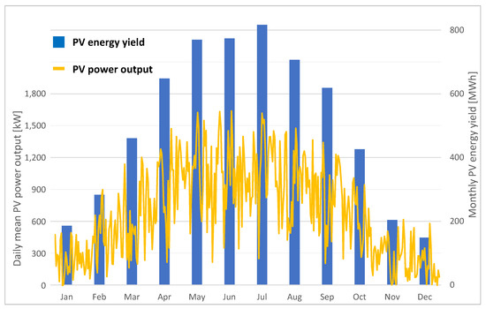 Figure 8 shows the PV power output and monthly energy yield over the course of one year. The monthly PV energy yield of all suitable roofs in Walheim combined is calculated in SimStadt (blue) and the daily mean PV power output in Walheim is shown in yellow, which is calculated with the specific PV load profile in INSEL.