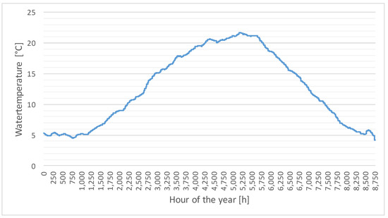 The sorted annual heat load from Figure 6 is used to choose the appropriate HP to match the demand of Walheim. Since the river Neckar flows directly next to the town, it serves as the heat source for the HP. The average daily water temperature between 1988 and 2014 at the measuring point in Besigheim, which is only a few hundred meters from the town of Walheim, varies between 4.21 °C in December and 21.71 °C in August (see Figure 9).