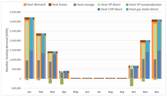 Figure 11 shows the monthly heat demand of Walheim (orange, in background) and how this demand is met by either the HP or CHP production and the storage (in front). On the left, the HP system plus storage is visualized in green, on the right in blue is the CHP and gas boilers plus storage. The CHP system always meets 100% of the demand, while the HP system has both under- and overproduction for most of the months. Overproduction for the HP occurs, when the storage tank is “full”, but the HP is still running for the remainder of the time step of one hour. This amount of energy is usable in reality, but leads to higher storage losses due to the temperature increase. This effect is due to the modeling time step of one hour. The storage (gray) is used in both systems, however the CHP unit can only produce significant surplus heat for storage in March, April, and October, when the monthly heat demand is considerately below 2000 MWh. In the summer months (May–September), the heating network is switched off, therefore only the storage losses remain.