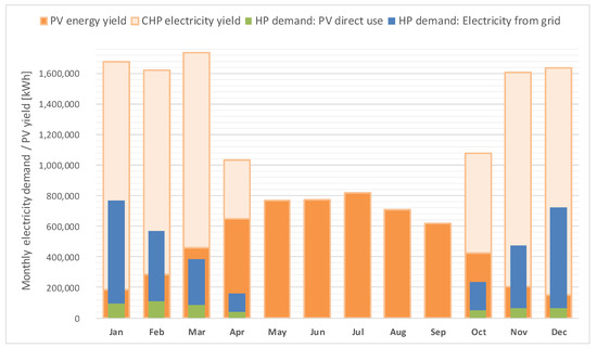 Monthly PV and CHP electricity yield and HP electricity demand.