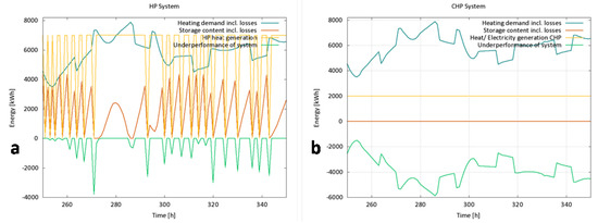 A period of 100 h in January is chosen to highlight the differences in heat generation and other KPIs for both systems (see Figure 13). In this period, the heat demand reaches its peak with a load of 7767 kW. In Figure 13 the modulation of the HP is clearly visible. The loads during hours 281 till 287 cannot be met by the HP directly. In most of those hours however, the demand can be met with heat from the storage, only for three hours the system does not produce enough heat. If the heat demand is lower than what the HP produces (e.g., in the first 10 h of the graph), the surplus heat fills the storage. This stored heat is then used to satisfy the heat demand when the HP turns off. However, when the HP is switched off and the demand is higher than the heat that is available in storage, there is a slight underperformance of the system. The deficit is only during one hour at a time and only once for two consecutive hours. The one-hour deficits are due to the model time step of one hour and do not have practical relevance, as the HP would switch on directly if the storage tank is below the threshold. This fact combined with the low-energy standard of the buildings and their surface heating system leads to the conclusion that this deficit is acceptable.