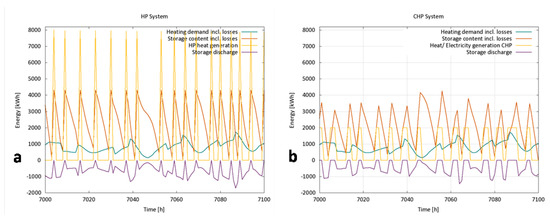 In Figure 14, 100 h in mid-October are shown for both systems. In this period, the heat demand is lower than in Figure 13, therefore the systems run differently. Figure 11a shows that the HP system runs only one hour at a time, before switching off for four or more consecutive hours when the heat demand is met from the storage. Since the power of the CHP unit is lower than of the HP, less heat can be loaded into the storage in Figure 14b compared to the HP system. Also, the CHP unit must run for more than one hour at a time and is switched off for only three to four consecutive hours.