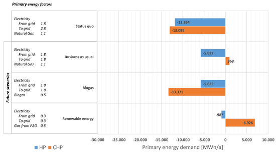 To demonstrate the influence of the energy carrier used as well as the influence of the current and future grid mix, different scenarios are calculated in Figure 15. The electricity generated by the CHP unit can be assessed in different ways, depending e.g., on how the electricity in the grid is produced and what type of gas is used. If the CHP runs on natural gas and the electricity from the CHP and PV is fed into a grid with predominantly fossil and nuclear electricity generation, it replaces this kind of electricity with renewable or co-generated electricity. The current factor in Germany for this replacement is 2.8 [56], which means that the electricity generated by the CHP and PV that is fed into this grid is valued 2.8 times higher than its actual amount of electricity (Figure 15—status quo). Since the CHP units produce more electricity than the HP, the overall balance of the CHP is better. However, when the electricity mix of the grid changes in the future due to the integration of increasingly renewable electricity (Figure 15—business as usual), this factor will have to change as well. Then, the surplus electricity would be worth less and the HP scenario wins against the CHP. If biogas is used in the CHP, the PEF for gas changes to 0.5. In this scenario (Figure 15—biogas) the CHP has the better primary energy balance. According to a meta-study by the Ökoinstitut and Fraunhofer ISI [57], the PEF for electricity in 2050 in Germany will be 0.3. Assuming an overall efficiency of 0.65 for the P2G process, this results in a PEF of 0.5 for gas from P2G (Figure 15—renewable energy). In this case, the primary energy balance for the HP system is the better one, because the P2G process is subject to high energy losses and the electricity fed into the grid by the CHP is not able to replace any fossil fuels anymore.