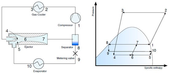 Schematic of a simple transcritical R744 vapor-compression system equipped with a two-phase ejector for expansion work recovery (left-hand side) and its p-h diagram (right-hand side) [13].