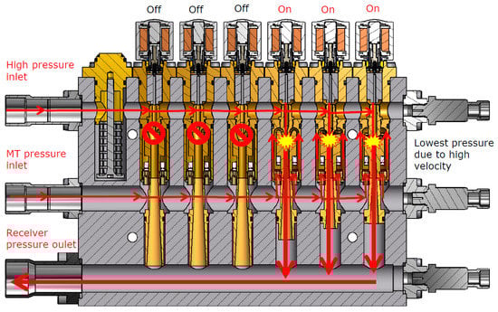 A solitary constant-geometry ejector cannot ensure an effective control of the heat rejection pressure and, simultaneously, implement expansion work recovery accurately [15]. In order to overcome such a drawback, the multi-ejector concept was formulated. As schematized in Figure 2, this relies on a block hosting several fixed geometry ejector cartridges of various size and arranged in parallel. The multi-ejector modules available on the market feature of 4–6 vapor ejectors and, as regards food retail applications, 2 liquid ejectors. At least one of the vapor ejectors is in operation and the necessary capacity is constantly fulfilled by changing their combination, besides guarantying the occurrence of the optimal high-side working conditions in any operating mode. Therefore, the mass flow rate required to meet the cooling load is available in any running mode, permitting to handle the variable demands appropriately. The scenario involving the use of 3 out of 6 ejectors is represented in Figure 2. Solenoid valves employed for activating the ejectors are located on the upper part of the block (Figure 2), while the pressure level can be measured by using the pressure sensors (located on the right-hand side in Figure 2) for each port (i.e., high pressure side, suction and discharge ports, located from the top to the bottom on the left-hand side in Figure 2). Typically, an expansion valve is arranged in parallel with the multi-ejector block to unceasingly and effectively control the gas cooler pressure to the detriment of some of the available expansion work recovery.