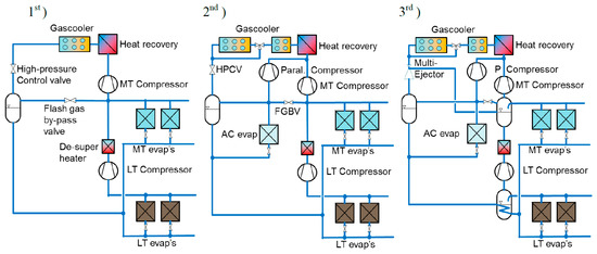Schematic of the 1st, 2nd and 3rd generation of “CO2 only” booster supermarket refrigeration system layouts [20].
