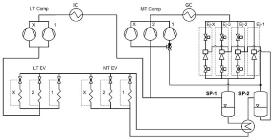 Schematic of a transcritical R744 booster supermarket refrigeration system outfitted with multi-ejector module and having MT overfed evaporators [10].