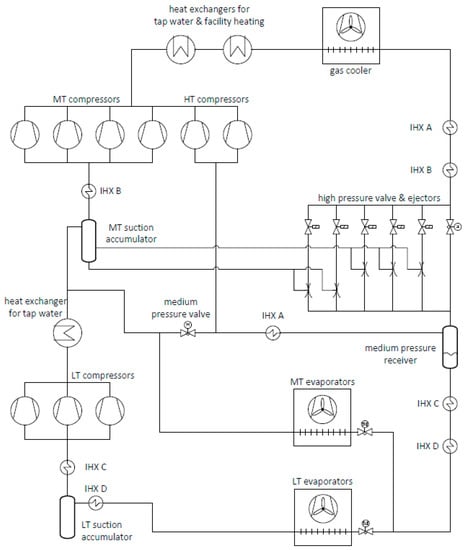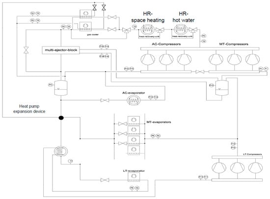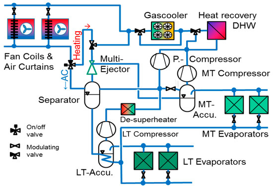 Fully-integrated (or all-in-one) solutions are tailor-made units, which successfully provide the entire refrigeration, air conditioning (AC) and DHW reclaims, alongside satisfying most of or even the whole space heating load of the selected supermarket [21,26,38,39]. According to [6], all-in-one transcritical CO2 supermarket refrigeration plants equipped with multi-ejector block (e.g., schematic on the right-hand side in Figure 3) are thought to significantly bring the total investment, maintenance and running costs down, besides offering other advantages [26], such as compactness, reduction in complexity of communication between all the entities responsible for operating the various units. Also, the adoption of these units permits overcoming the persisting problem represented by the selection of the best refrigerant for AC and heating applications. The system layout schematized in Figure 6 and adopted in a supermarket in the North of Italy simultaneously implements both the all-in-one and multi-ejector concept [21].