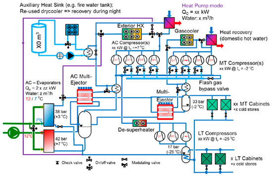 The unit architecture sketched in Figure 7 represents a suitable solution for supermarkets located in Southern Europe or Middle East [40]. The solution features: (1) the presence of two multi-ejectors modules (i.e., one dedicated to refrigeration loads and the other to AC purposes); (2) the implementation of the “principle of pivoting” (see Section 3.4.1); (3) the use of MT and LT overfed evaporators; (4) an exterior heat exchanger (HX) operating as an additional evaporator to increase the amount of recoverable heat in wintertime and as a gas cooler in AC mode; (5) an auxiliary heat sink upstream of the multi-ejector blocks to cool R744 down and (6) the integration of ice-water cooling evaporators coupled with the AC multi-ejector block to increase the suction pressure of the parallel compressors.