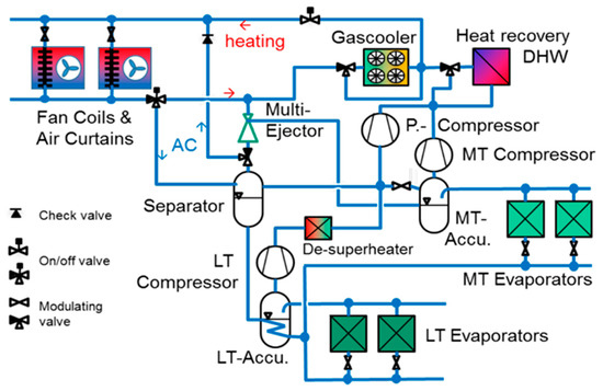 Integration of direct heating and cooling fan coils and air curtains in a transcritical R744 supermarket refrigeration system (multi-ejector block partly by-passed in AC mode) [40].