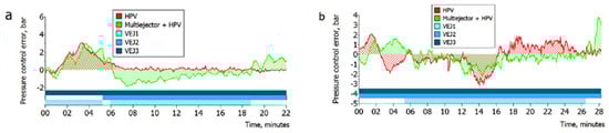 The experimental results presented in [15] suggested that the heat rejection pressure can be satisfactorily controlled by a multi-ejector block in commercial refrigeration applications. As showed in Figure 10, in fact, the researchers evaluated similar profiles of the discharge pressure control error caused by a rapid change in both load and outdoor temperature between a standard high pressure electronic expansion valve (HVP) and a multi-ejector module.