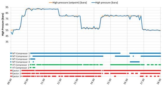 The field measurements gathered in [42,43] revealed that a multi-ejector module can successfully switch the gas cooler/condenser from floating condensing to heat recovery mode and vice versa (as showed in Figure 11 after 13:00) as well as the MT evaporators from superheated to overfed mode and vice versa. In the reference example, the authors also found that the minimum number of ejectors needed to reach the discharge pressure set points without too many on/off switches of these devices was 3. Finally, they demonstrated that the control system can suitably handle possible blockages of an ejector nozzle.