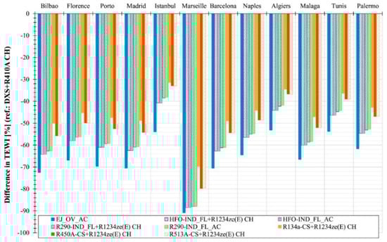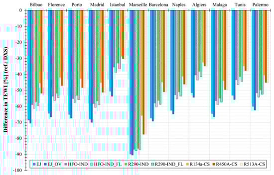 Difference in TEWI among various supermarket refrigeration solutions (DXS: R404A unit; EJ: multi-ejector based system with MT overfed evaporators; EJ_OV: multi-ejector based system with MT and LT overfed evaporators; -IND: indirect arrangements with MT flooded evaporators; -IND_FL: indirect arrangements with MT and LT flooded evaporators; -CS: cascade arrangements) in several locations positioned below the CO2 equator (tMT = −4/−10 °C, tLT = −27/−35 °C, = 120 kW, = 25 kW) [52].