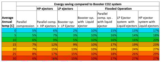 Madsen and Kriezi [53] recently showed that the implementation of the multi-ejector concept (solution similar to that in Figure 4) leads to energy savings from 13% to 29% compared to the conventional booster unit in locations featuring an average annual temperature between 0 °C and 30 °C (Figure 15).