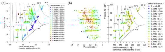 (a) Motive nozzle mass flow rate as a function of the motive nozzle inlet conditions for one of the investigated ejectors; (b) Ejector efficiency as a function of the motive nozzle inlet conditions and suction pressure ratios for one of the investigated ejectors [15].