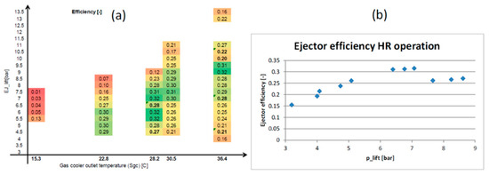 Comparison between the ejector efficiencies measured in the laboratory (a) and those estimated in a real application performing in heat recovery mode (b) [55].