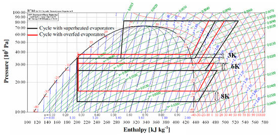 - Gullo, P.; Cortella, G.; Minetto, S.; Polzot, A. Overfed evaporators and parallel compression in commercial R744 booster refrigeration systems—An assessment of energy benefits. In Proceedings of the 12th IIR Gustav Lorentzen Natural Working Fluids Conference, Edinburgh, UK, 21–24 August 2016. [Google Scholar]