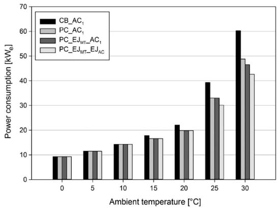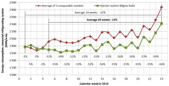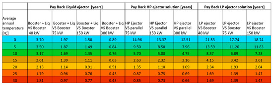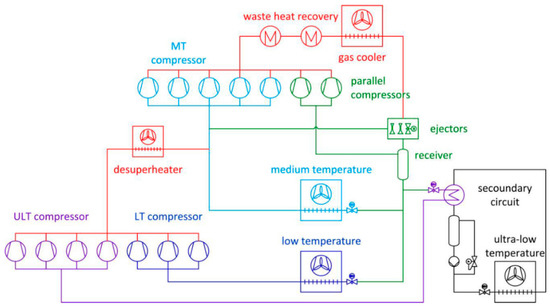 Pisano [47] stated that a food retail store located in Bari can decrease its energy consumption by almost 30% by replacing a conventional booster unit with a multi-ejector based booster solution (similar to that in Figure 4) (Figure 13).
