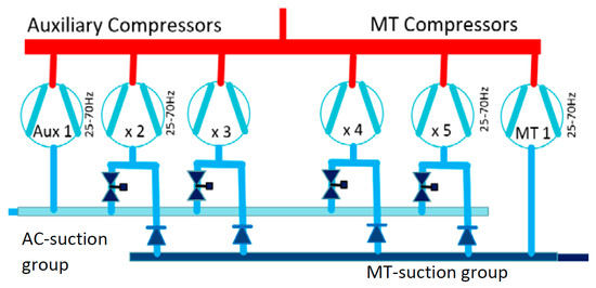 A first step towards the adoption of such HFC-free solutions in warm areas is offered by the 2nd generation [20,21], i.e., parallel compression-equipped units (schematic on the middle in Figure 3). The adoption of parallel (or auxiliary) compression permits MT compressors to be unloaded for the sake of use of auxiliary compressors, which perform at a higher suction pressure (and thus at more favorable operating conditions) than the former. As a consequence, energy savings can be achieved compared to the 1st generation. The investigation by Karampour and Sawalha [26], based on some filed measurements, recently revealed that parallel compression offers high energy savings in cold climates, while it is not fully suitable for hot climates. Parallel compression-based R744 systems have been widely studied by many researchers (e.g., [27,28,29]).