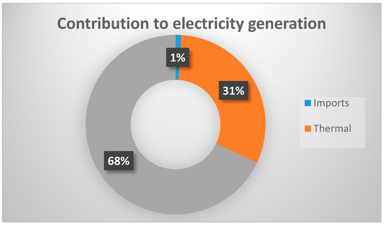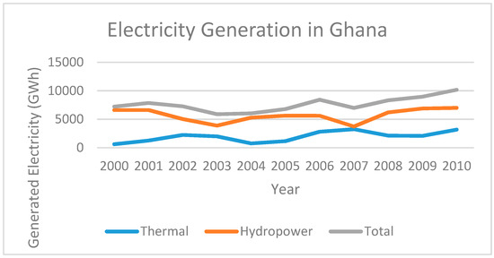 Ghana generates most of its electricity from two large hydropower stations: the Akosombo and the Kpong dams. Together, they provide about 65 percent of the total 2200 MW of electricity supplied in the country [9,47]. Thermal power plants that operate on fossil fuels supply the remaining 35 percent (Figure 5).