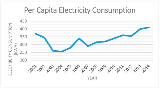 Pattern of Electricity Consumption per Capita in Ghana over Time from 2001–2014 [40].