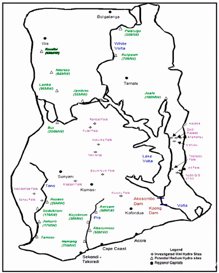 - Dernedde, S.; Ofosu-Ahenkorah, A.K. Mini Hydro Power in Ghana; Ghana Energy Foundation: Accra, Ghana, 2002. [Google Scholar]
