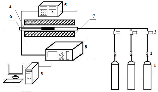 Diagrammatic sketch of a fixed-bed reaction system: (1) Gas cylinder, (2) valve, (3) mass flow controller, (4) thermocouple, (5) temperature controller, (6) quartz reactor, (7) horizontal tube furnace, (8) gas analyzer, and (9) data acquisition system.