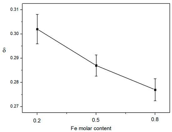 The oxygen non-stoichiometry δ of La1−xCaxCo0.5Fe0.5O3−δ (x = 0.2, 0.5, 0.8) and La0.5Ca0.5Co1−yFeyO3−δ (y = 0.2, 0.5, 0.8) were determined by iodometric titration. For each sample, the experiment was done three times to reduce experimental errors, and the results of three experiments were averaged to obtain the final results, as shown in Figure 4 and Figure 5.