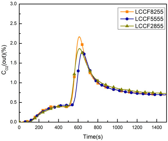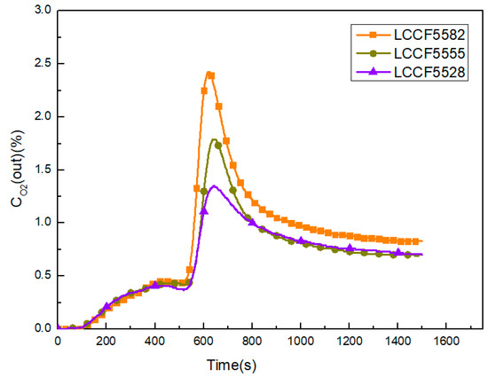 Five LCCF samples of different stoichiometry (LCCF8255, LCCF5555, LCCF2855, LCCF5582, and LCCF5528) were synthesized by the liquid citrate method, and the fixed-bed reactor was used to study the oxygen desorption performance of LCCF. The adsorption temperature and desorption temperature were 800 °C and 850 °C, respectively. The oxygen desorption curves of LCCF perovskite with A-site Ca-doping are given in Figure 6. There was a plateau-like peak at about 500s in the initial stage of the exposure to CO2, which may have been caused by the reversible defect reaction (1). The result agreed with the study by Yang et al. [4]. Then, the O2 concentration increased sharply due to the carbonation reaction. For LCCF8255, there was a maximum oxygen concentration of about 2.2%. The carbonation reaction of LCCF8255 is as follows: