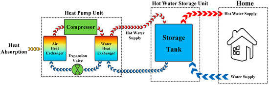 An HPWH absorbs warmth from the surrounding air and transfers it to heat water. Hence, it is also referred to as ‘air-source heat pump’. A tank is used in the HPWH structure to store the amount of hot water used in a day. Figure 1 demonstrates the schematic diagram of the heat pump water heater. It operates on electricity, but is roughly three-times more efficient than a conventional electric water heater [25]. Actually, the heat pump uses a small amount of energy to move heat from one location to another. Therefore, heat pump water heaters are known as high-efficiency and energy-saving appliances. HPWHs provided around three percent of Australian households’ hot water in 2012 [25]. In Japan, it is expected that the numbers of HPWHs will be around 10 million in 2020 [15].