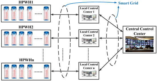 The main point about HPWH is that the power consumption can be controlled during operation. This means that by providing the appropriate control signal, the power consumption can be decreased or increased. The hierarchical control of HPWHs is shown in Figure 2. There is a bidirectional relation between the central control centre and the local control centre; also, the relation between the local control centre and HPWHs is bidirectional. The central control centre determines the amount of power for frequency control, and the local control centre sends the available power through all HPWHs in the system. In the lower layer, the local control centre collects the data of available HPWHs for frequency control. Moreover, it can send the control signal for HPWHs. All these connections are possible under the smart grid concept, which uses information and communication technology. The recent smart grid control approaches for central and distributed levels of HPWHs were investigated in [26].