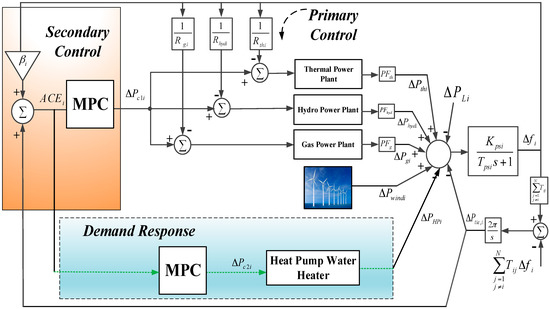 MPC is a control approach based on the state-space model prediction of the system. Indeed, MPC provides inputs to the system based on the model and optimization. The objective function is defined by the system designer, and quadratic programming is used for optimization. The MPC method is successfully applied for frequency control of power systems [17,18,19]. The MPC application is also reported for LFC in multi-area power systems with: wind turbines [20], electric vehicles [21], superconducting magnetic energy storage [22], photovoltaic generation [23] and a multi-terminal high voltage direct current-connected grid [24]. Meanwhile, application of MPC in LFC with HPWH is not addressed in the literature.