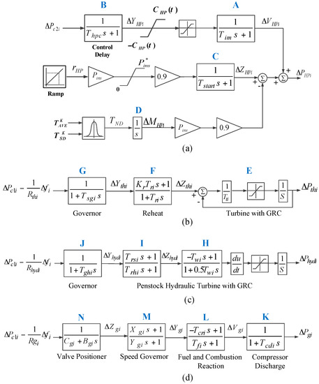 In a multi-area power system, the frequency performance is not just improved by the generators in a specific area; it is also improved by the generators in other areas through the tie-line power. A two-area power system including thermal, hydro and gas generation units in each area is considered as the system under study. HPWHs are added to both areas. Figure 3 shows a sample control area (i) of the considered power system. The system dynamics (state-space model) should be represented clearly in order to apply the MPC approach to the system. To follow the two-area power system model, a block diagram representation of the considering thermal, hydro and gas units and HPWH is shown in Figure 4. To be more accurate, the generation rate constraint (GRC) nonlinearity is also applied in the models of thermal and hydro units. All the considered parameters have been defined in the Nomenclature Section.