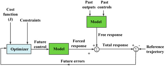 The structure of the applied MPC controller in this study is shown in Figure 5. MPC uses an internal model to predict the future plant outputs based on the past and current values of the inputs and outputs and on the proposed optimal future control actions. The prediction includes two main components known as the free response and the forced response. The free response is the expected behaviour of the output assuming zero future control actions. The forced response is the additional component of the output response due to the candidate set of future controls. In a linear system, the total prediction can be calculated by summing both the free and forced responses; the reference trajectory signal is the target value that the output should attain. The optimizer is used to calculate the best set of future control actions by minimizing a cost function (J), and the optimization is subject to constraints on both manipulated and controlled variables [28].