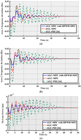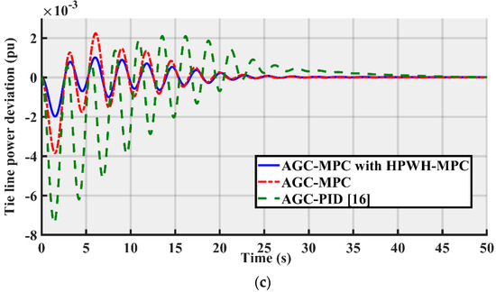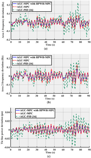 Simulation results including frequency deviations of Areas 1 and 2 and the tie-line power deviation are shown in Figure 10. It has been noticed that with the proposed MPC controller with the participation of HPWH, the system is more stable compared to the system with MPC for AGC alone and the controller applied in [16]. Moreover, the oscillation damping of the proposed MPC is better than the other controllers.
