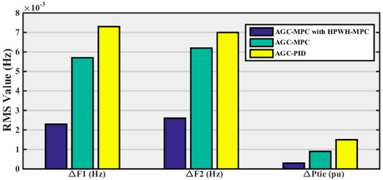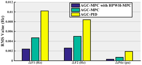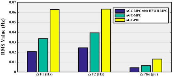 The maximum deviation value, peak time and settling time are shown in Table 5 for the frequency and tie-line deviations after parameter variations. In addition, Figure 13 shows the RMS value of deviation for the three controllers clearly. The proposed MPC for AGC and HPWH has the minimum RMS value of deviation compared to the other two controllers.
