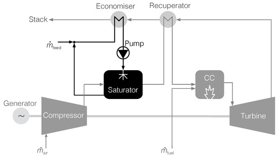 By introducing a saturation tower and a humidification unit (shown in black), the mGT cycle (in grey) is transformed into an mHAT.