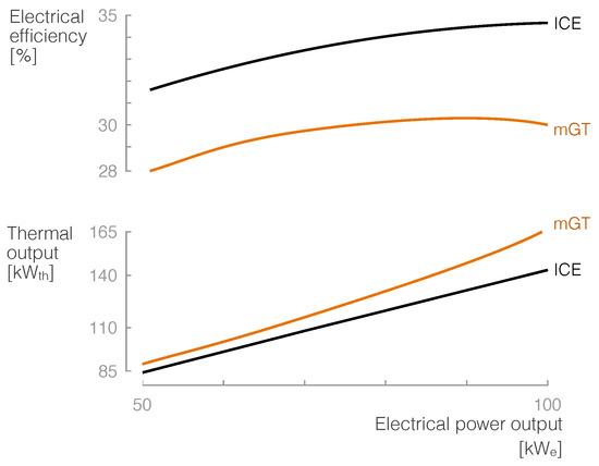 The studied mGT is the Turbec T100, with a nominal electrical power output of 100 kWe and a thermal power output of 165 kWth [48]. The studied reciprocating ICE is the 2G Cenergy Patruus Series, an engine running on natural gas with an identical nominal electrical power output (100 kWe) but with a thermal output of 143 kWth [49]. Both the T100 and the Cenergy Patruus are representatives of their specific cycle. As widely known, reciprocating ICEs have higher electrical efficiencies than mGTs. This is also obvious in the studied units: while the electrical efficiency of the 2G Cenergy amounts to 34.8%, the Turbec T100 is limited to 30% at nominal conditions and International Organisation for Standardisation (ISO) ratings [48,49]. The part load electrical efficiencies and thermal power output for both units are depicted in Figure 2.