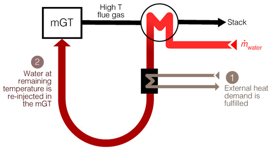 When converting an mGT into an mHAT, a saturation tower (shown in black in Figure 1) is added in between the compressor and the recuperator. Thus, whenever the external heat demand is low and there is no useful output for the heat produced by the mGT, the exhaust gases can be utilised to warm up water (as in the traditional CHP configuration), but this water is routed towards the saturation tower and sprayed over the compressed air. Humidifying the mGT therefore enables increasing the electrical efficiency in moments of low external heat demand by recovering the heat in the exhaust gases and injecting it back into the cycle. This means that the operational flexibility of the units is enhanced, as they are able to run in cogeneration mode when there is an external heat demand and with water injection the rest of the year. The detailed thermodynamic mechanisms that lead to an increase in electrical efficiency through water injection can be found in [20].