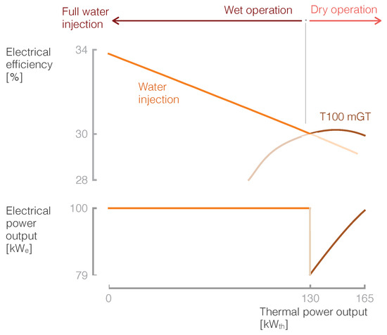 When the heat demand is between 130 kWth and 165 kWth, it is not worth injecting water as the electrical efficiency actually reduces. For heat demand values below 130 kWth, the mHAT operates at a full electrical load with water injection.