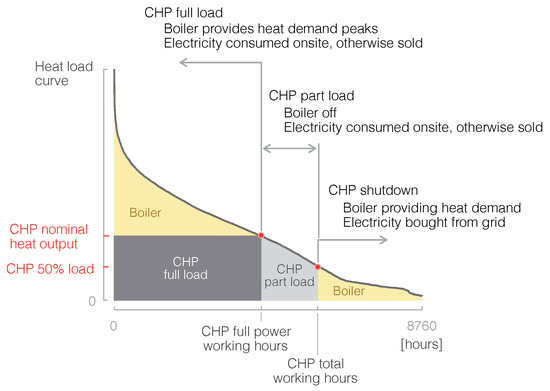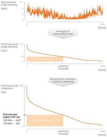 The sizing procedure followed in this study is the maximum rectangle area method, commonly used for cogeneration units. This methodology finds the capacity of the energy generator that covers the maximum energy consumption; thus, it minimises the primary energy required to fulfil the demand of the user [53,54,55]. As the units run following the heat demand, the sizing is performed based on the heat load curve of the users. Traditionally, the sizing of CHP units starts from the demand of the user and looks for the engine size that best suits it; some examples can be found in [56,57]. In this study, we have followed a reversed method: as we have accurate data on specific machines, we group the demand corresponding to several single dwellings (assuming they would all belong to a large building or a small neighbourhood) to fit the studied technologies.