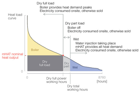 As opposed to mGT and ICE, the mHAT cycle is thus capable of following the heat demand of the user while maintaining a high electrical efficiency and without dumping heat that could be potentially used for external heating. Thereupon, mHAT can run all year long: see the summary of mHAT operational strategy based on the user’s heat load curve in Figure 6. mHAT operation is ruled by the mode that leads to the highest electrical efficiency: if the external heat demand is high enough (above 130 kWth) the mHAT runs dry (either at part or full load), as a common mGT. For lower heat demands, the unit operates in wet mode with an incremented electrical efficiency.