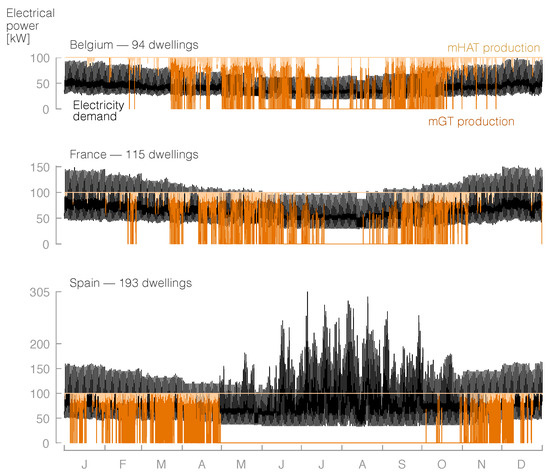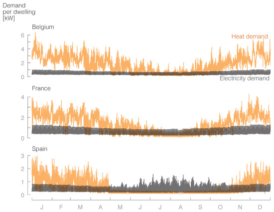 The hourly heat and electricity demands follow similar patterns in France and Belgium; nevertheless, in Spain, they differ: the shorter winters result in a minimum heat demand from May until November, and the use of air conditioning is obvious from an increased electricity demand in the summer.