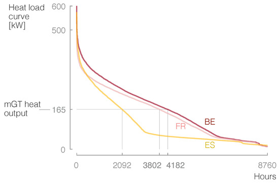 Users with a constant heat demand throughout the year are the perfect candidates for CHP units as they can fully benefit from the high nominal energy efficiencies. Small-scale cogeneration could also potentially provide the energy needs of a group of dwellings—in a large building or a neighbourhood, for example [7]. The main issue for this type of consumers is that the heat demand is variable during the year, peaking in winter and reaching minimum values in the summer [8]. When the heat demand is not high enough, the exhaust gases of the small scale CHP units have to be blown off at a high temperature; thus, the overall cogeneration efficiencies (of around 80% to 85%) are reduced to the electrical efficiency. For the case of mGTs, their rather low electrical efficiency results in unsustainable operation. The units are thus forced to shutdown in these situations, which in turn reduces their profitability.