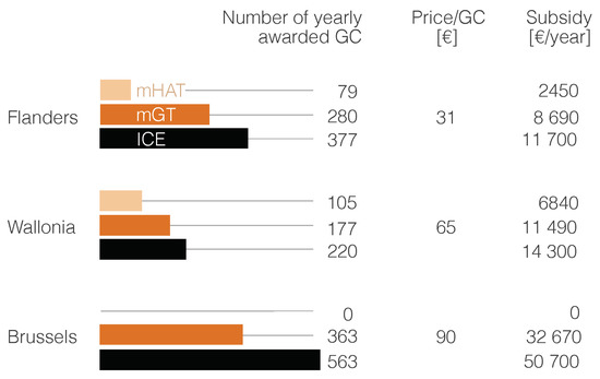 Within the Belgian legislation, energy is managed both by the federal government and by the regions (Wallonia, Flanders and Brussels). Nonetheless, energy efficiency has been a fundamentally regional competence since 2013, when the federal government withdrew tax reductions for cogeneration. Hence, CHP in Belgium is currently supported at the regional level through different regional Decrees. In all regions, a certificate-based support system is enforced, although the practical implementation differs between them. Whereas Wallonia and Brussels have certificates that comprise both renewable energy and cogeneration—Green Certificates (GC)—Flanders gives specific certificates for cogeneration—CHP certificates.