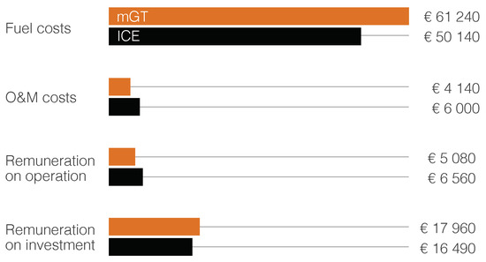 The mGT and the reciprocating ICE units run following the heat demand: the excess or lack of electricity is sold/bought to/from the grid depending on the electricity demand at a given moment.