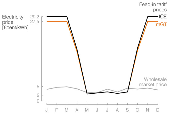 The cogeneration technologies sell their surplus electricity in the wholesale market, where price fluctuations are wide and common during the day and throughout the year. In this case, our aim has been to track the price per kWh in the wholesale market throughout the year to simulate a price scenario as realistic as possible. Hence, a more methodical approach has been followed: as hourly data cannot be publicly accessed, monthly averages based on the available literature for 2018 for the three countries have been calculated, leading to the curves also shown in Figure 9 [59,60,61].
